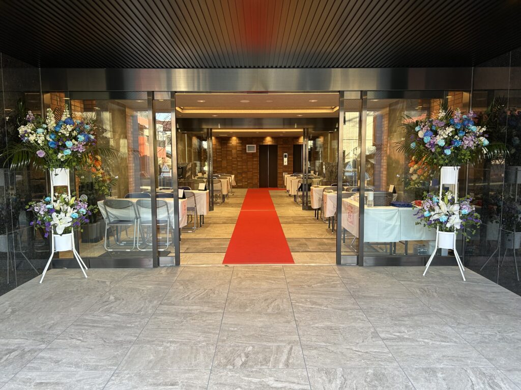 物件のイメージに合わせ、スタンド花の設置や各ブースの設営など、内覧会場の準備を行います。